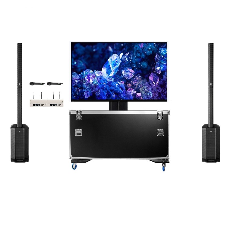 Ce pack comprend une TV 4K FULL HD de 85 pouces avec ascenseur et flight case pour une qualité d’image incomparable, deux enceintes colonnes HK Polar 12 pour un son clair et puissant, et un micro UHF Shure GLX D4 pour une prise de parole nette et précise.