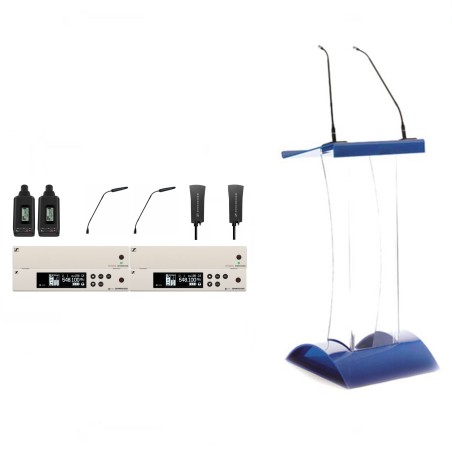 Lorsque vous louez notre pupitre de conférence, vous bénéficiez également de deux micros col de cygne de qualité supérieure, équipés de deux émetteurs sans fil Sennheiser ME36, ainsi que de deux récepteurs Sennheiser True Diversity pour une qualité sonore exceptionnelle.